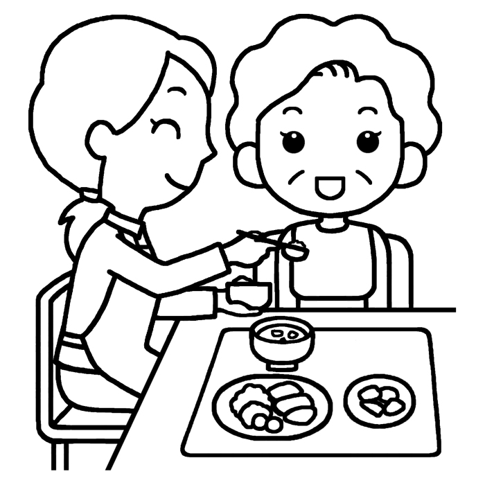 食事介助1(白黒)/食事/訪問介護/介護・医療/無料イラスト素材