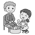 入浴(介助)足湯のイラストです。おじいさん、おばあさん、ベッドで足湯1・2など。