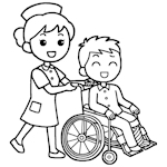 車椅子のイラストです。車椅子の女性・男性、車椅子で移動する女性・男性、など。